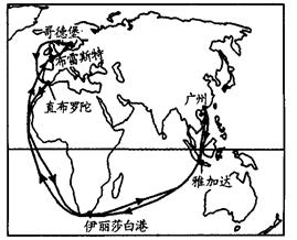 3、单选题 哥德堡港,自18世纪初随着瑞典海运业的发展和繁荣而逐渐成为瑞典第一大港。大航海时代以哥德堡港命名的“哥德堡”号帆船,曾三次远航中国广州。右图为1743—1745年“哥德堡”号第三次远航广州航线图。据此完成下列问题。