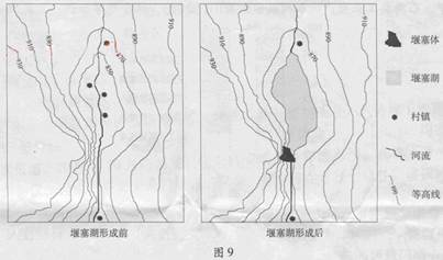 1.从两图的对比可看出,堰塞湖是由于堰塞体堵塞河道而形成的,而堰塞体多是由于山体滑坡形成的。