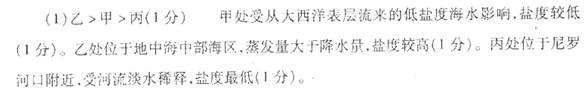(1)甲、乙、丙三处海域表层海水盐度从高到低排序为?,简要分析甲、乙、丙三处海域表层海水盐度差异的原因。(4分)