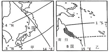 (1)甲、乙两图比较,比例尺较大的是_____________图(1分)。说出判断依据(2分)(2)简述A国冬、夏季降水的空间分布差异。(2分)