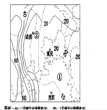 【小题3】②地位于四川盆地,四周高,其水汽不易扩散,所以1月晴天出现频率低;而云雾多,大气对太阳辐射的削弱作用大;冷空控制下,水汽含量较少;1月受东北季风的影响,云量少。故选D。