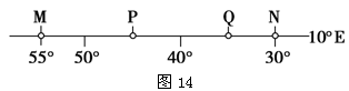 4、单选题 图14所示为世界地图上的一段经线,MP、QN为陆地,PQ为海洋,据此完成问题。