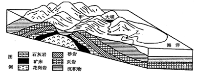 小题1:图中甲地的岩层向上弯曲,所以其地质构造应为背斜,又因地表地势低,其地貌是谷地,所以甲地应属于背斜谷。故选B。