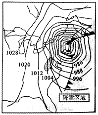 本题解析:(1)来自大西洋的飓风在登陆时带来了大量的水汽,在陆地上遇到了寒冷的气团,再加上位于阿巴拉契亚山的迎风坡,地形抬升形成了暴雪的天气。
