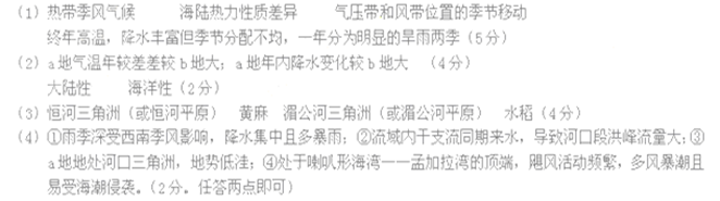 (1)飓风登陆时携带大量水汽(2分),与陆地冷空气相遇(或该地区位于阿巴拉契亚山的迎风坡)(2分),所以形成暴雪。