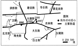 4、单选题 城市商业活动空间布局滞后于城市空间地域扩张。读广州市1990年——2007商业活动重心坐标变化图,回答问题。
