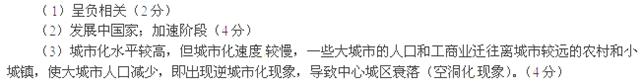 3、综合题 (10分)在不同的国家和不同的发展时期,城市化速度不尽相同。图甲显示的是1950年以后世界城市化水平与城市化速度之间的关系(图中城市化率即城市人口的比重);图乙是城市化进程的三个阶段。读下图,回答下列问题。