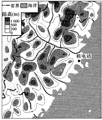 (1)我国东部地区能源矿产普遍缺乏,从图中可以看出,该省位于我国东部地区,降水丰富,河流水量大,且地势起伏较大,因此适宜水能资源的开发,主要常规能源是水能。核电站的区位条件一般从市场需求、技术条件量方面分析。
