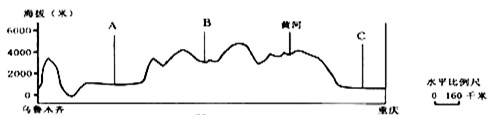 材料二:乌鲁木齐至重庆的地形剖面示意图