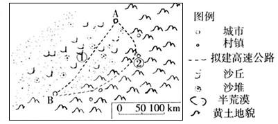 4、综合题 如图所示,拟在A地与B地之间建设高速公路,有两种选线方案:方案①通过半荒漠地区,所需建设成本约为15亿元;方案②通过地形破碎、人口较稠密的区域,所需建设成本10亿元。试比较两种方案的优缺点。