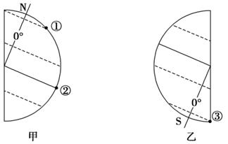 (1)描述甲图时北半球昼夜长短的纬度差异。