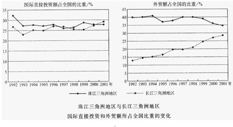 A.2001年,长江三角洲地区国际直接投资额占全国的比重首次超过珠江三角洲地区 B.长江三角洲地区外贸额占全国的比重不断上升,并超过珠江三角洲地区 C.珠江三角洲地区外贸额占全国的比重从1993年起一直呈下降趋势 D.图中所示的变化与外商投资区位选择的变化有关 |