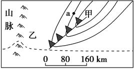 【小题1】图中冷锋大致自南向北移动,说明南部纬度低,北部温度高,位于南半球;甲周围等压线闭合,形成气压中心,该气压中心西侧等压线弯曲最大的地方形成锋面,说明甲处为低压中心,南半球低压中心呈顺时针辐合运动,因此图中a点风向为偏北风。