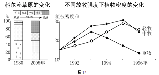 (1)土地(草地)退化(2分)?草原的产草量减少,草质变劣,沙化扩大,导致荒漠化。(2分)
