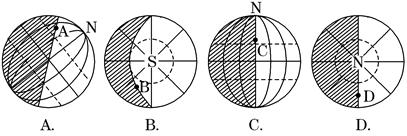 3、单选题 在下面四幅图的A、B、C、D四点中,处于黄昏的是