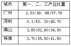 2006年珠江三角洲部分城市产业结构比重