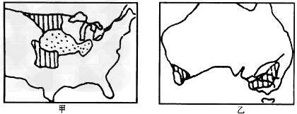 小题1:根据图示农业地域类型的分布判断,甲主要分布于东亚、东南亚和南亚地区,故判断为水稻种植业,夏季高温多雨,雨热同期和丰富的廉价劳动力是其分布的主要优势区位;而乙分布于美国中央大平原地区,为商品谷物农业,该地区水热条件较为充足、地形平原、土壤肥沃和地广人稀等是其分布的主要区位优势,故B项符合。