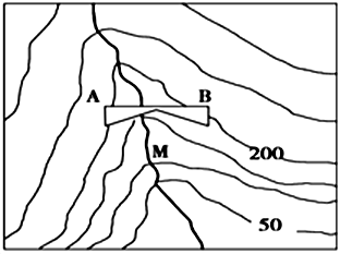 本题解析: 【小题1】据图可知:A、B海拔高度在200-250m之间,M海拔高度在100—150m之间,由此可知桥面与谷底M的相对高度在50—150m之间。C正确。 【小题2】北极星在B方向上空,即图右侧为正北方向,所以A地在M地西南。A正确。 考点:相对高度计算、方位判断。