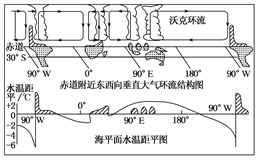【小题1】“沃克环流”它是指在正常情况下较干燥的空气在东太平洋较冷的洋面上下沉,然后沿赤道向西运动,成为赤道信风的一部分,当信风到达西太平洋时,受到较暖洋面的影响而上升再向东运行,如此形成了一个封闭的环流。结合海陆分布,大洋东部气流下沉为主,水温低,为寒流;大洋西部气流上升为主,水温高,为暖流;水温距平低值位于大洋东岸,此海域为寒流,综上所述,应选B项。