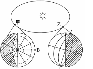 5、单选题 比较下面四幅图(注:甲、乙、丙三图中,阴影区为黑夜),回答小题。