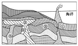 【小题1】根据图中岩层结构可以判断,在①~⑤岩层中,③岩层形成时间最早,其次是上覆的①岩层,⑤岩层是在第一次岩浆活动中出现的,②与④是在第二次岩浆活动中同时形成的,根据以上分析可以看出,答案D正确,故答案选D。
