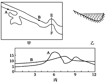 3、单选题 下图中甲是我国东部河流某河段示意图,乙是EF河段河床示意图,丙是河流A、B两水文站测得的水位变化图。读下图,完成1—3题。