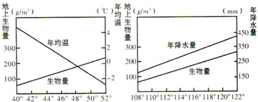 4、单选题 生物量一般是指生物在某一特定时刻单位面积内实存生活的有机物质(干重)(包括生物体内所存食物的重量)总量。图为“我国某区域地上生物量、年均温和年均降水量随经纬度的线性变化图”。读图回答问题。