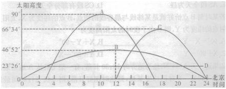 1、综合题 下列A、B、C、D四条曲线表示不同纬度在6月22日的太阳高度日变化,读图回答以下问题。(12分)