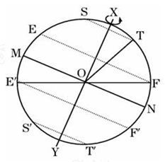5、单选题  如图XOY为地轴,MN为赤道,EF、E′F′为回归线,ST、S′T′为极圈,读图回答下列各题。