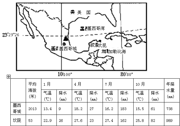 | (2)结合材料,对比墨西哥城和坎昆的气候特征的差异。(4分) (3)在坎昆气候大会上,中国近几年来“节能减排”的成效赢得国际社会的赞誉。我国在控制CO2排放量,实施低碳经济方面采取的可行性措施有哪些?(4分)