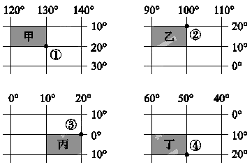 【小题2】四幅图中阴影部分所表示的经纬线方格,面积最大的是( )