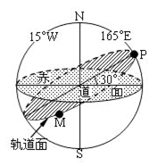 2、单选题 下图为某宇宙飞船M绕地球公转轨道及方向的示意图。M第一次到达P点时的时间是2013年5月5日16时(美国太平洋时间),飞船往返于最南与最北的时间间隔是1小时。据此回答下列各题: