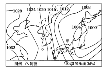 (1)按气压高低状况,甲是___ ___;其中心气流的运动方向是___________。按气流运动状况,乙是___ _____;其中心天气为_____ _______。(4分)