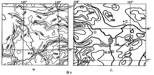 本题解析:本题考查我国的区域地理。(1)根据图示的等高线分布,①处海拔为500—1000米之间;②处海拔0—200米,故计算两地的落差为300---1000米,(2)根据图示的经纬度判断图甲的南部地区地形起伏较大,其位于季风区,故水土流失较严重;产生的原因可从地形、气候等自然原因和不合理的人类活动等方面分析。治理措施主要针对当地的植被保护分析。(3)图示丁河自A流向B的区域等高线分布周高中低,判断为盆地。(4)河流的水文特征可从河流的流量、流量的季节变化、含沙量、冰期、流速等方面分析。