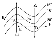 1.图中温度最低和最高分别是2.若此图表示太平洋海区,则乙的洋流名称是