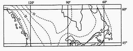 5、单选题 该图是某地气温年较差等值线分布图(单位:℃),读图回答问题。1.关于图示地区气温年较差空间分布的叙述,正确的是2.由图中数据可直接得出的结论是3.与同纬度亚欧大陆比较,该地区气温年较差