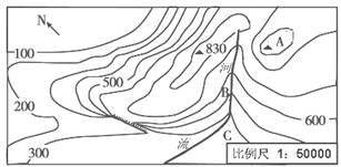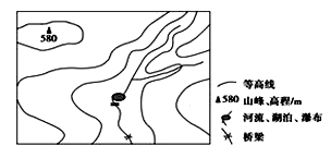3、单选题 下图示意某小区域地形。图中等高距为100米,瀑布的落差为72米。据此完成下列各题。