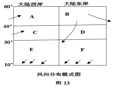 (1)根据甲、乙、丙、丁四种气候类型的分布规律,在图13中与其相对应的位置分别是(填写代表字母)??、?、?、?。