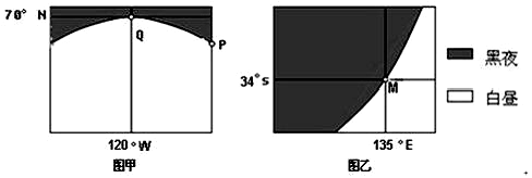 ⑷该日,Q、P两地的夜长大小关系是?,M地昼长为??。(4分)