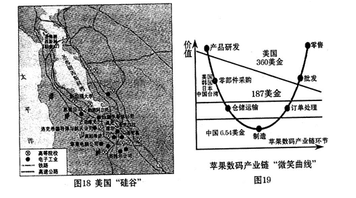 材料二?美国“硅谷”图(图18)和苹果产业链“微笑曲线图”(图19)。