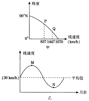 5、单选题 下图中地球自转线速度随纬度变化图(图甲)和地球公转线速度变化图(图乙),回答图甲中P点的纬度,图乙中N点对应的月份分别是