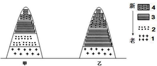 【小题1】由题干可知雁荡山是流纹岩古火山,岩石类型应当是岩浆岩;根据地壳物质循环过程可知,左图中“丁一进一出”应当是岩浆,那么甲是变质岩,乙是岩浆岩,丙是沉积岩,故选项B正确。