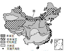【小题1】甲地区成为我国风能资源最丰富地区的原因有 A.风沙天气比较频繁 B.大气对流运动强烈 C.位于我国的季风区 D.地势比较平坦开阔