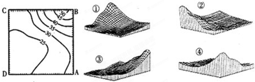 3、单选题 下图左侧为沿海某地区等高线图,右侧是以30度视角分别从A. B. C. D四点俯看本区的网面立体图,据此回答下题