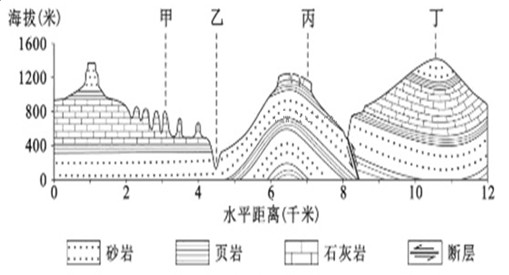 【小题2】甲地为峰林,乙处为河谷,乙处为外力侵蚀作用最强烈,丙处坡度大易发生滑坡现象,丁处是典型的向斜山。