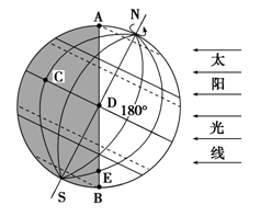 (1)夏至日太阳直射点的纬度位置为23.5°N,太阳直射点的经线为图示B点所在经线,根据与180°经线的关系计算为120°W;地方时为0时的经线即A点所在经线,与B点所在经线相对,故为60°E;D点为晨线与赤道的交点,地方时为6时,AB即将进入昼半球,判断为晨线。