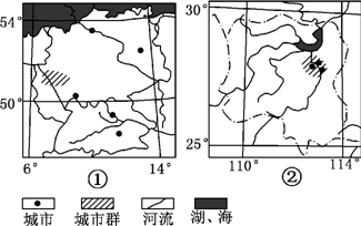 | 小题2:有关①②两区域的人文特征,叙述正确的是( ) A.人口稠密,自然增长率都较高 B.两区域南部均以电子工业为主 C.②区域北部为重要的粮棉产区 D.①区域城市群目前发展迅速
