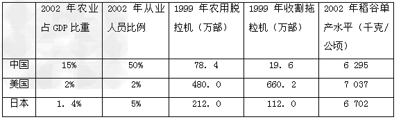参考答案:(1)①农业机械化水平低,科技水平低、以至劳动生产率低下。②农业从业人员比例过高③政府的农业保护力度低