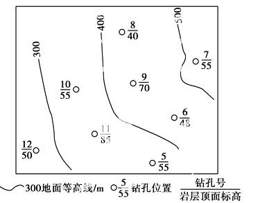 【小题2】背斜脊线是中部高,两侧低.地面海拔在300-400米之间的岩层顶面标高中,11孔的85米最高,