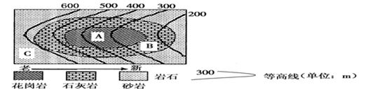 【小题2】背斜顶部受到张力被侵蚀成谷地,是内外力共同作用的结果。图中BC岩层为沉积岩,可能找到化石;A为岩浆岩,不可能存在石油。所以本题选择C选项。